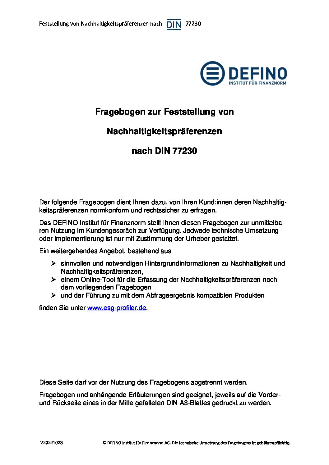 DEFINO bietet zur vereinfachten Umsetzung der Abfrage von Nachhaltigkeits-Präferenzen einen aus dem ESG-Modul der DIN 77230 abgeleiteten Fragebogen an.